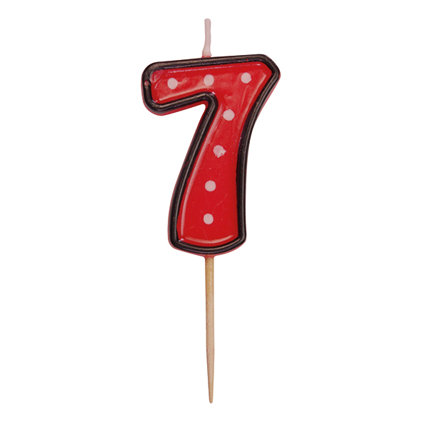 Číselná sviečka z vosku v tvare čísla 7 s výškou 50 mm na špajdli. Určená na dekoráciu tort.