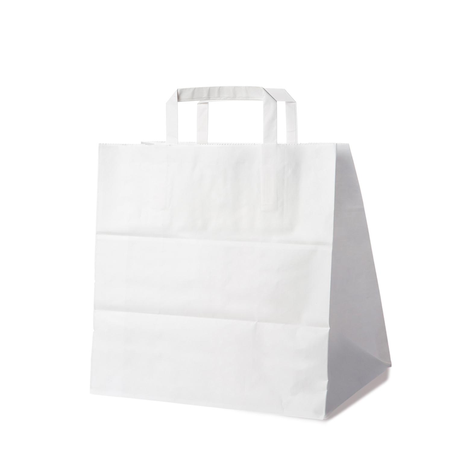 Biela papierová taška s rozmerom 32+21 x 33 cm. Určená na balenie väčších darčekových predmetov alebo viacerých kusov tovaru. Široké dno poskytuje pevnú podporu pri prenose. Balenie obsahuje 250 ks.