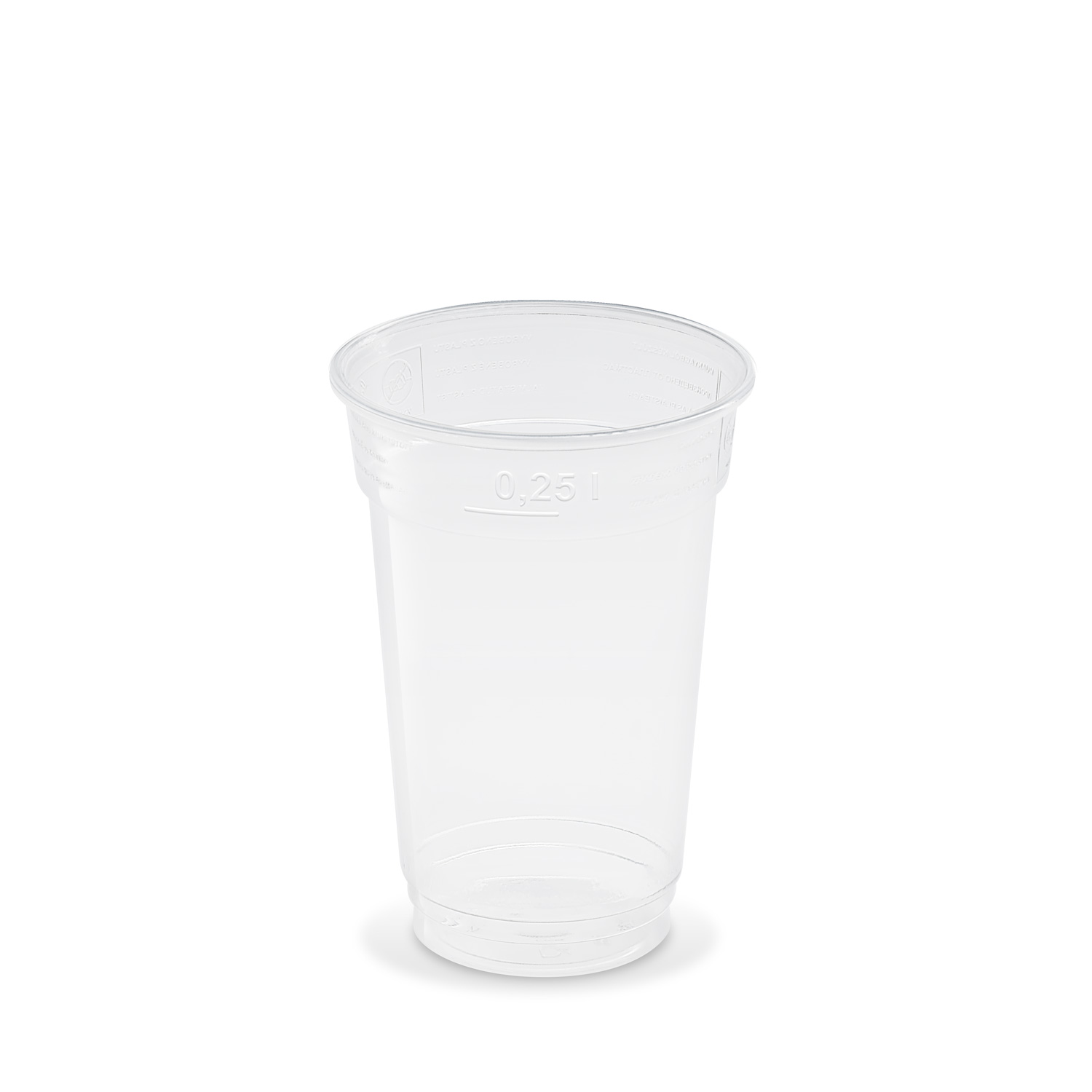 Plastový pohár z materiálu rPET s priemerom 78 mm a objemom 0,25 l určený na podávanie nápojov.