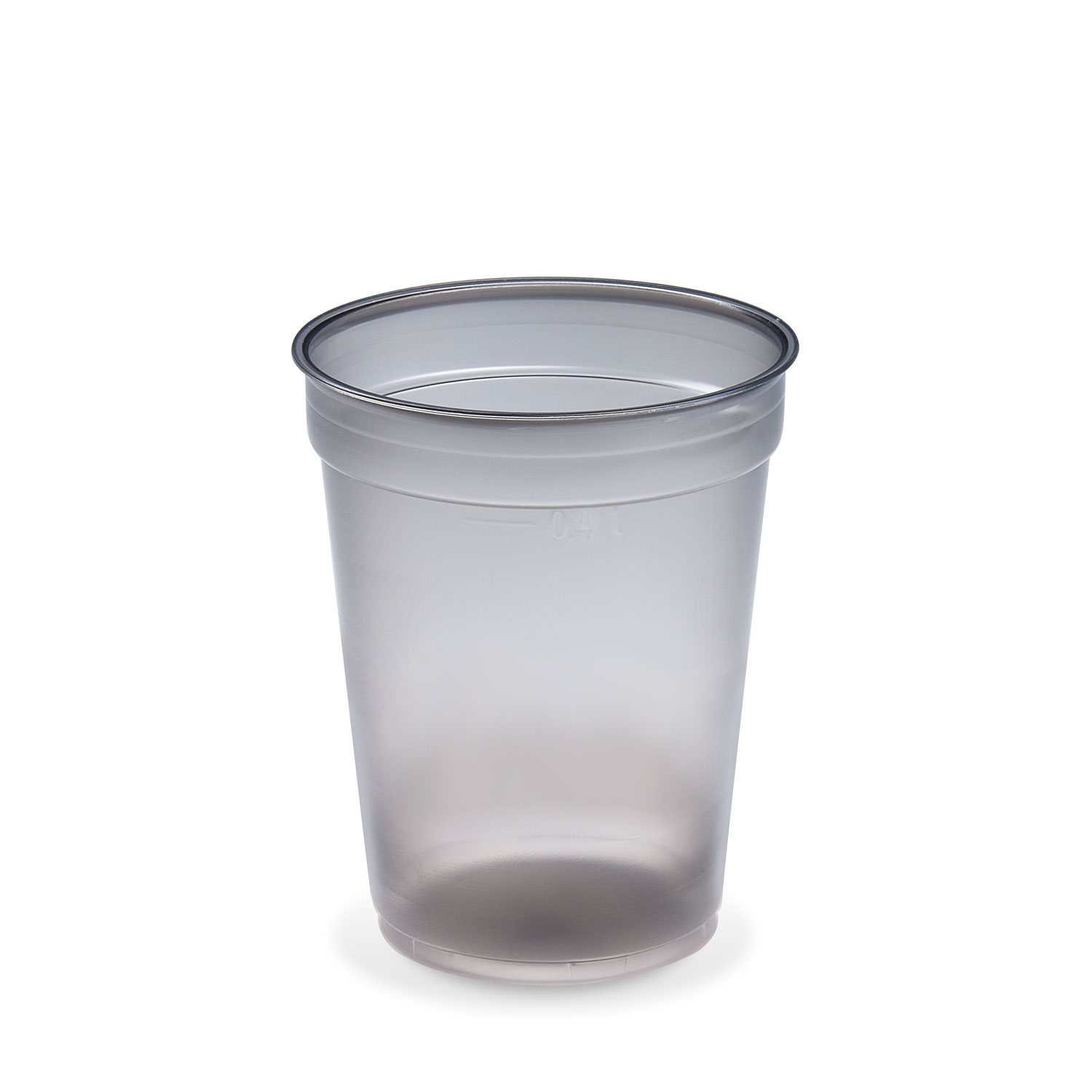 Plastový pohár z materiálu PP v dymovom prevedení s priemerom 95 mm a objemom 0,4 l.