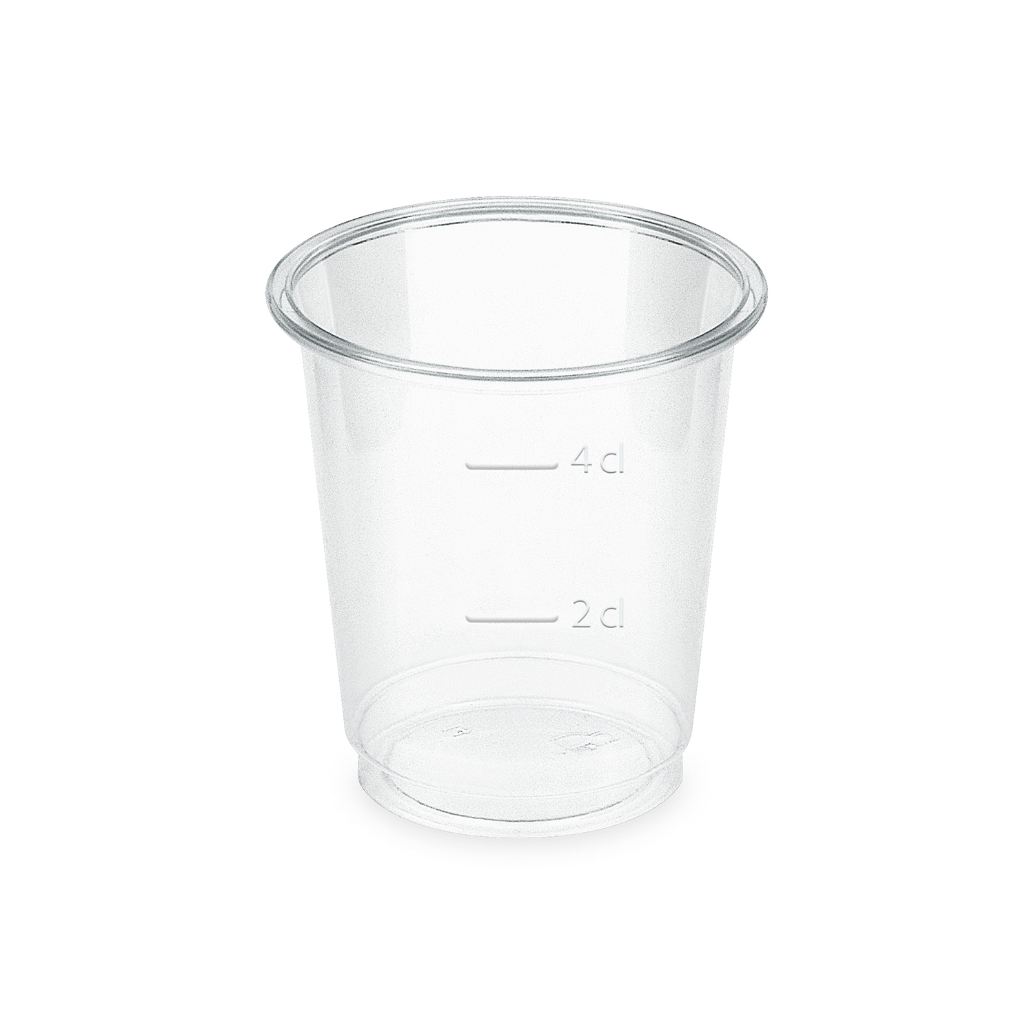 Bioplastový pohárik z materiálu PLA s priemerom 48 mm a objemom 2 cl alebo 4 cl určený na podávanie nápojov.