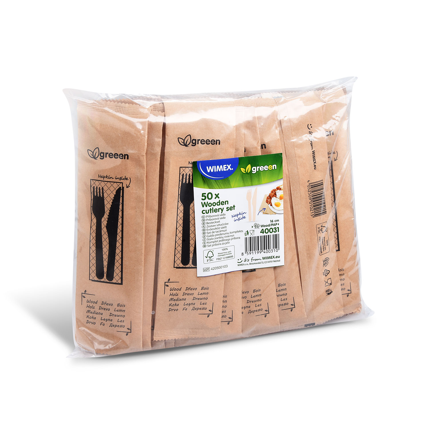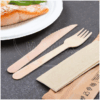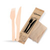 Sada príborov z dreva FSC 100 % obsahujúca nôž, vidličku a obrúsok. Určená na jednorazové použitie.