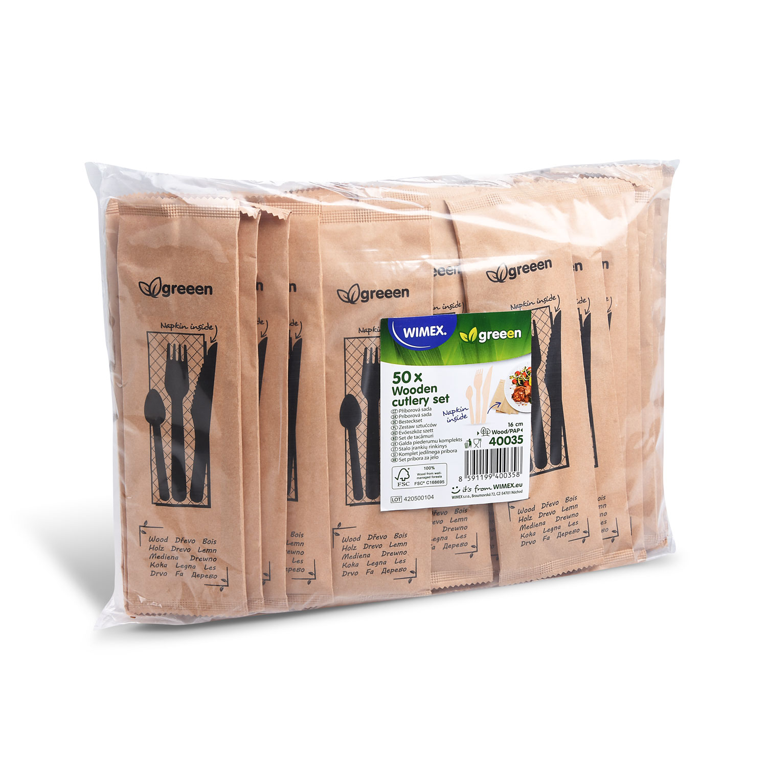 Príborová sada drevená FSC 100% nôž + vidlička + lyžička + obrúsok (50 sád)